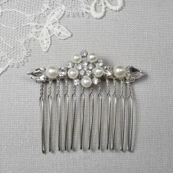 Clear diamante and faux pearl embellishment, white Swarovski pearls, clear diamante and finished on a silver plated comb.